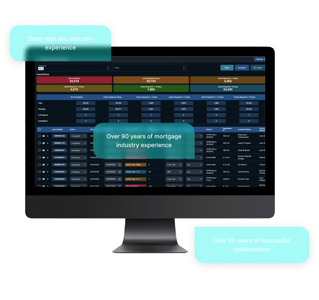 Our global team has decades of hands-on experience in mortgage servicing, investment, and origination, and proven success building the tech solutions the industry needs. We know where the product gaps are in servicing, and we’re ready to fill them with an easily integrated suite of transformative solutions that save your operation time and money. From automation to handle the heavy lifting in multiple operational areas, to predicting potential compliance risk, to portfolio monitoring that drives higher returns, to the first smart customer portal – we understand the mortgage industry’s complex technology challenges, and we’re solving them.